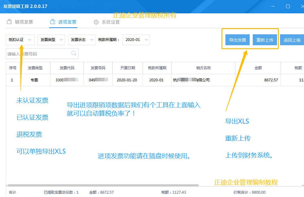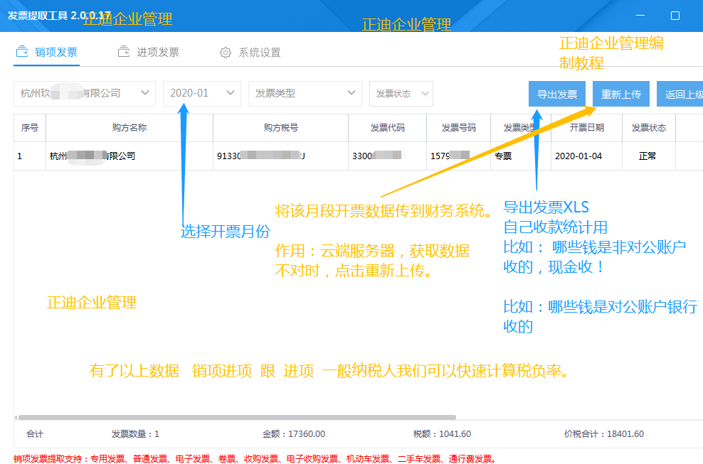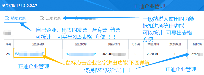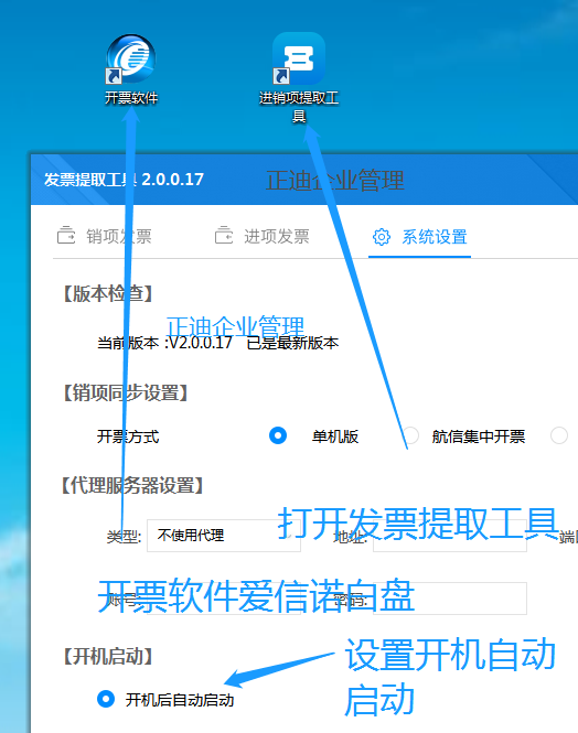 目录 1.安装软件 ,软件系统设置。 2.开票数据获取 (仅限白盘 爱信诺) 3.进项数据(一般纳税人获取) 作用跟功能简介: 数据可以导出XLS(方便企业核对数据) 方便标记是否,个人账户已收款(现金) ,对公银行已收款, 自动上传数据到财务系统 方便一般纳税人计算税负率。 文章下方详解 安装软件 系统设置 在开票电脑上安装。 系统设置 如下图:点击系统设置 ,选单机版(白盘 爱信诺)。 开票数据获取 (仅限白盘 爱信诺) 如图:点击 销项发票 , 点击企业名称进入 (安装在开票的电脑 默认会显示企业名字。) 点击导出发票 可以导出XLS,方便企业计算成本,核对客户收款等。 重新上传, 在财务软件系统远程数据不完整情况下 ,切换月份点击重新上传。 XLS 导出样式 进项数据(一般纳税人获取) 如图:点击 销项发票 , 点击企业名称进入 (首次使用 要点击新增企业 一般纳税人企业使用) 作用方便企业统计 ,方便二次计算税负率。同时跟财务系统联通。 重新上传, 在财务软件系统远程数据不完整情况下 ,切换月份点击重新上传。